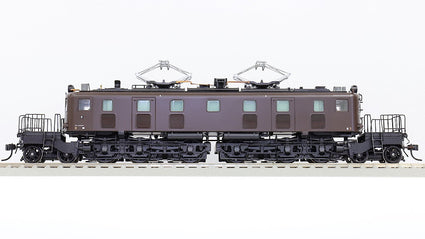 This product is painted in the JNR standard brown color and represents the later model, featuring an H-rubber-supported front window, recessed taillights, an LA15 lightning arrester, and lightweight PS14 pantograph. The lightning arrester is located in front of the pantograph.